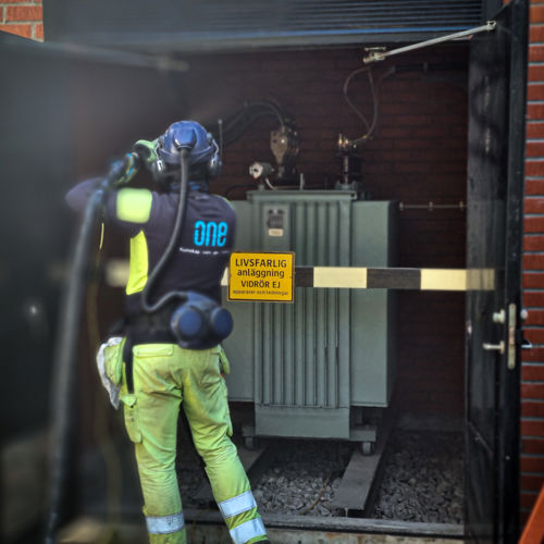 Isblästring innebär att vi kan gå in och städa nätstationer utan att nätägaren behöver stänga av elen. En stor fördel för alla nätägarens kunder som slipper produktionsstopp.