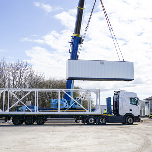 Här kan du ser hur det går till när vi lyfter in ett batteri till en mindre energipark. Med hjälp av en lyftkran går lyftet smidigt. Därefter kan vi koppla in batteriet mot elnätet.